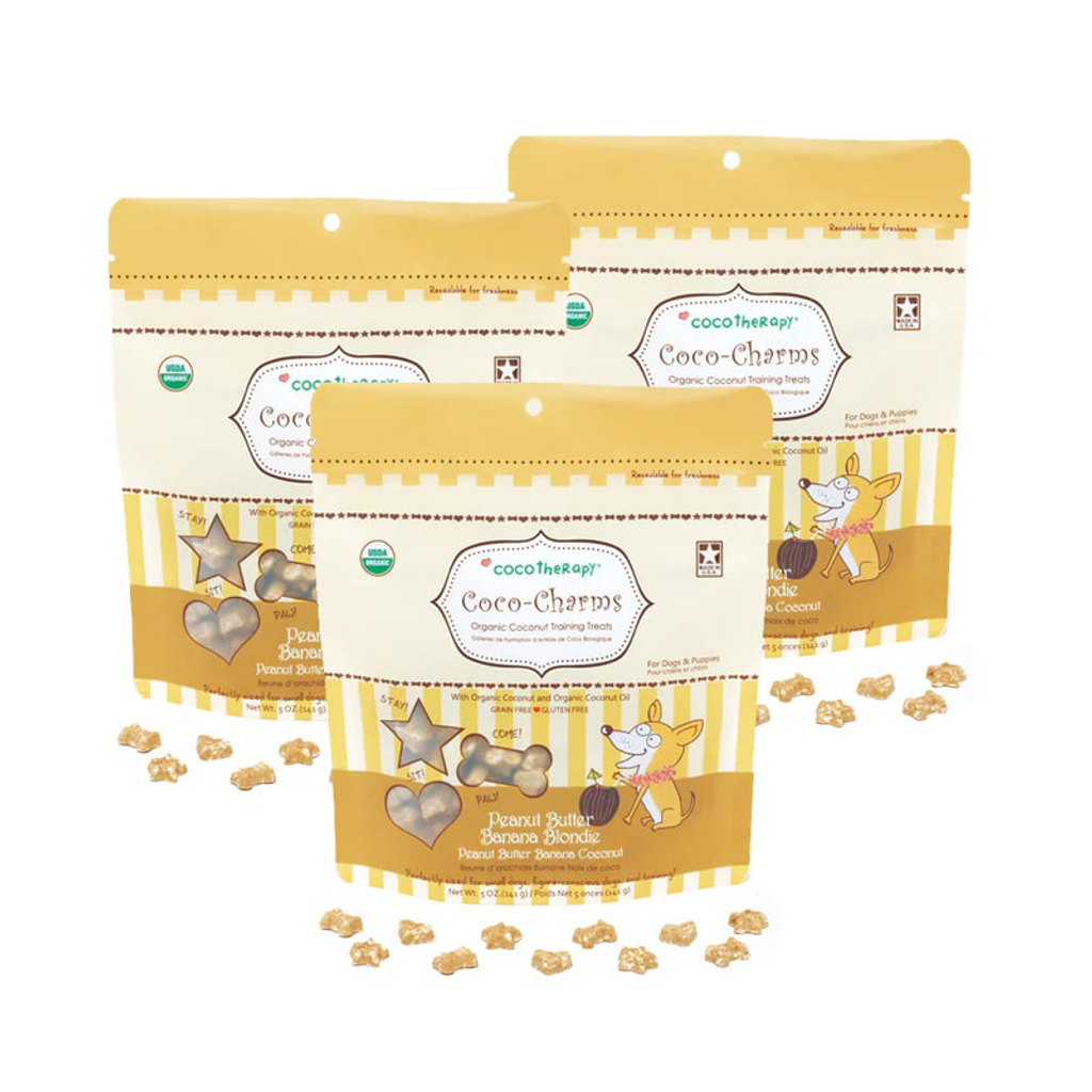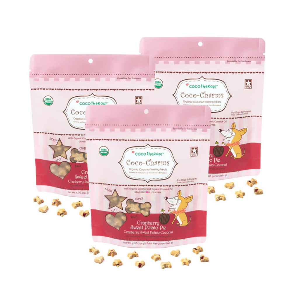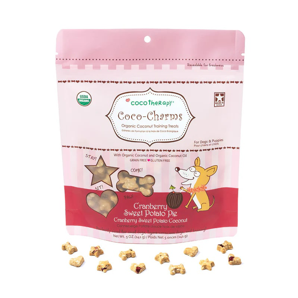 CocoTherapy Coco-Charms™ Training Treats are made using 100% organic and non-GMO ingredients that are not only good for your furry friend, but ridiculously delicious too! Absolutely vegan, grain and gluten free, dairy free, no eggs, and made with no preservatives, colors, or artificial flavors, so dogs with sensitive tummies or allergies can enjoy them too. Perfectly sized for training, small dogs, or figure-conscious dogs!