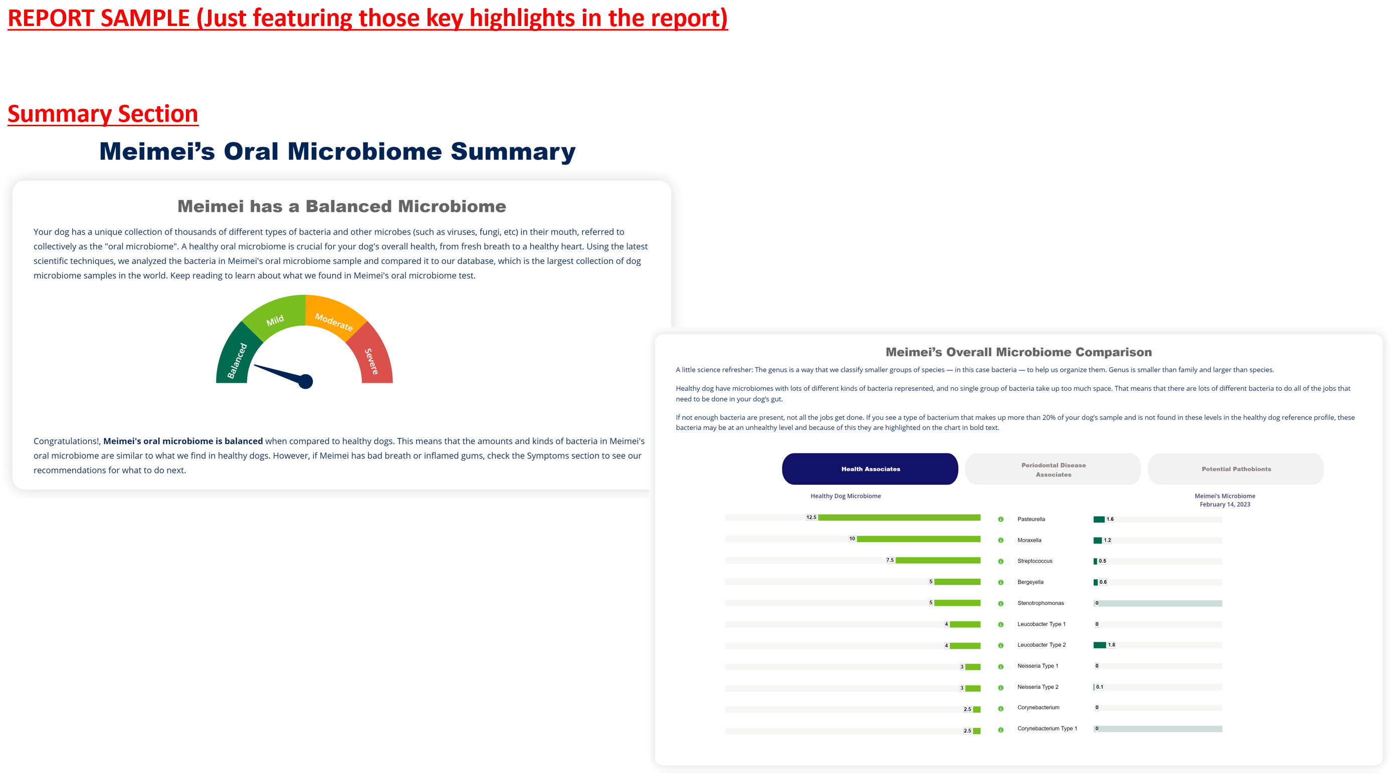 When you access your Pet Portal account to view your pet's results, you can also see examples of oral microbiomes from other pets (if you are interested in comparing microbiome diversity). If you test your pet's oral microbiome over time, you'll be able to see any trends for your pet.