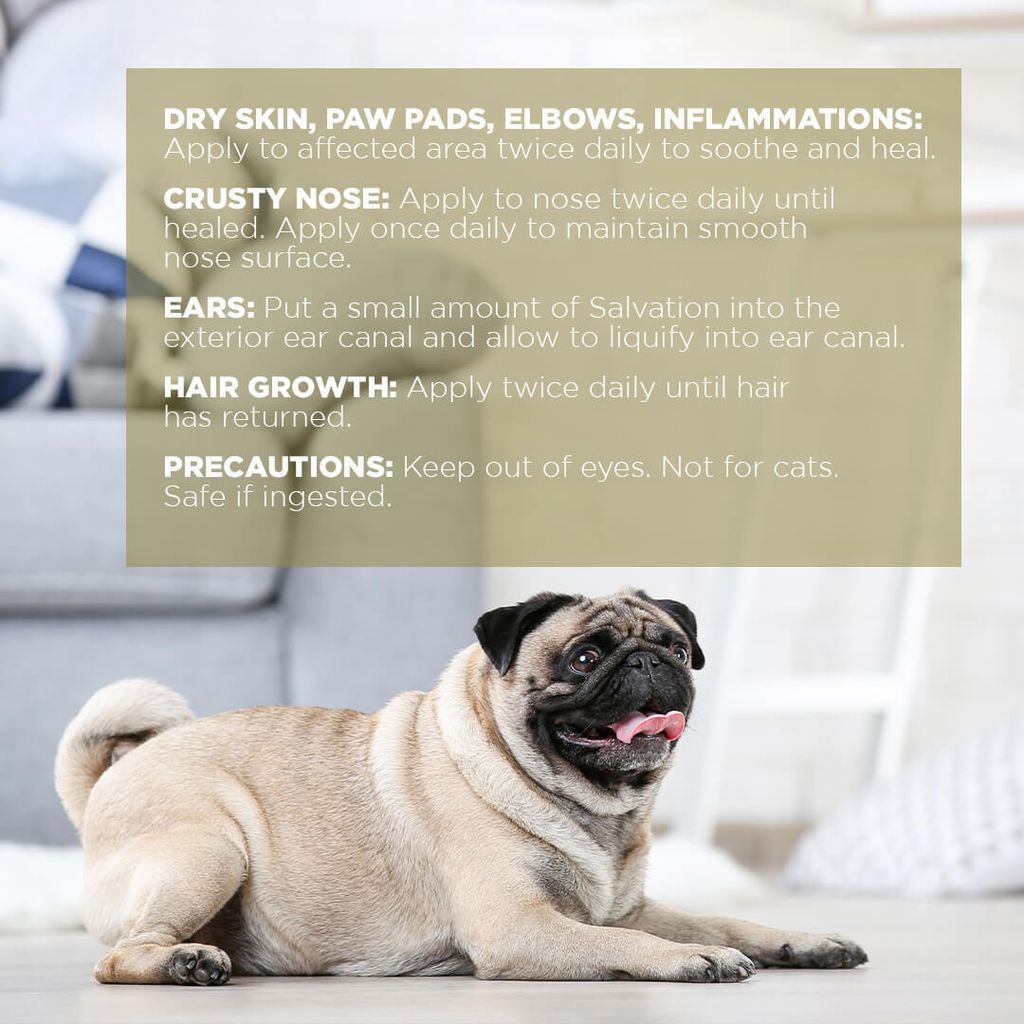 Salvation is a multipurpose healing salve for your dog's skin, paws, ears, and nose.